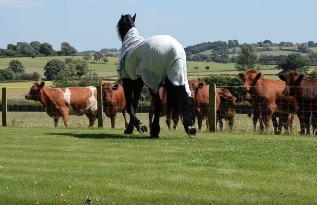 Den stora majestätiska hingsten inser att han har kossornas uppmärksamhet – se nu när han vänder sig om