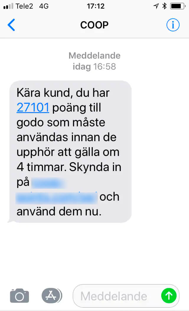 ”Kära kund, du har 27101 poäng till godo som måste användas innan de upphör gälla om 4 timmar. Skynda in och använd dem nu”, skriver bedragarna och hänvisar till en bifogad länk.