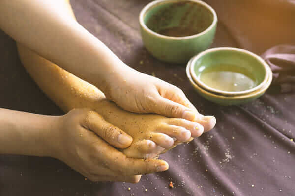 Massera sedan fötterna i 5 minuter med denna skrubb. När du har gjort detta så sköljer du av fötterna precis som vanligt.