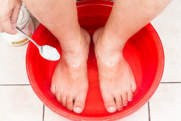 Första steget är att tappa upp ett fotbad med varmvatten. I vattnet ska du hälla i två matskedar salt och två matskedar bikarbonat. Blanda runt vattnet innan du sjunker ned med bägge fötterna i badet.