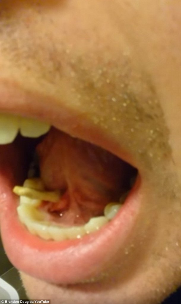 Brandon kände någonting hårt i munnen, det han sedan filmade kommer garanterat få dig att kräkas.