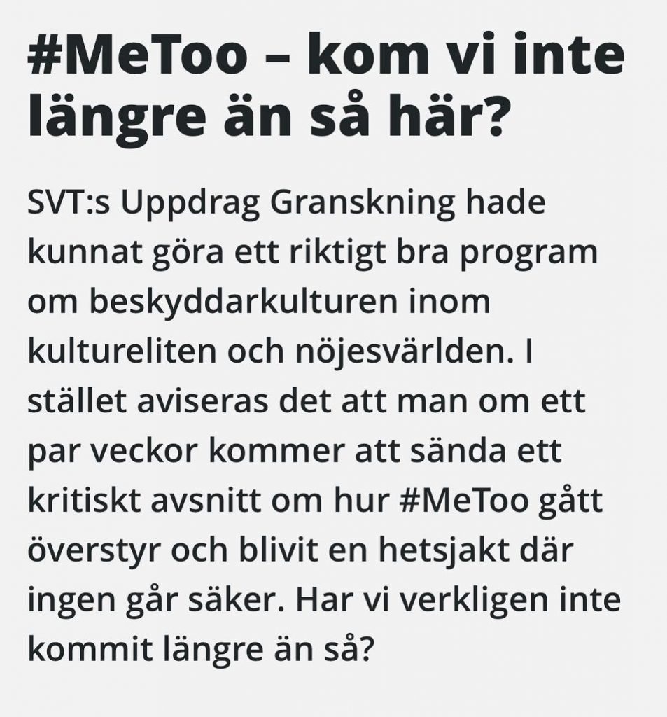 I hennes senaste inlägg på Instagram slår hon till ordentligt mot SVT:s Uppdrag Granskning efter att det framkommit att dem ska sända ett avsnitt om hur #metoo har gått för lång där ingen går säker.