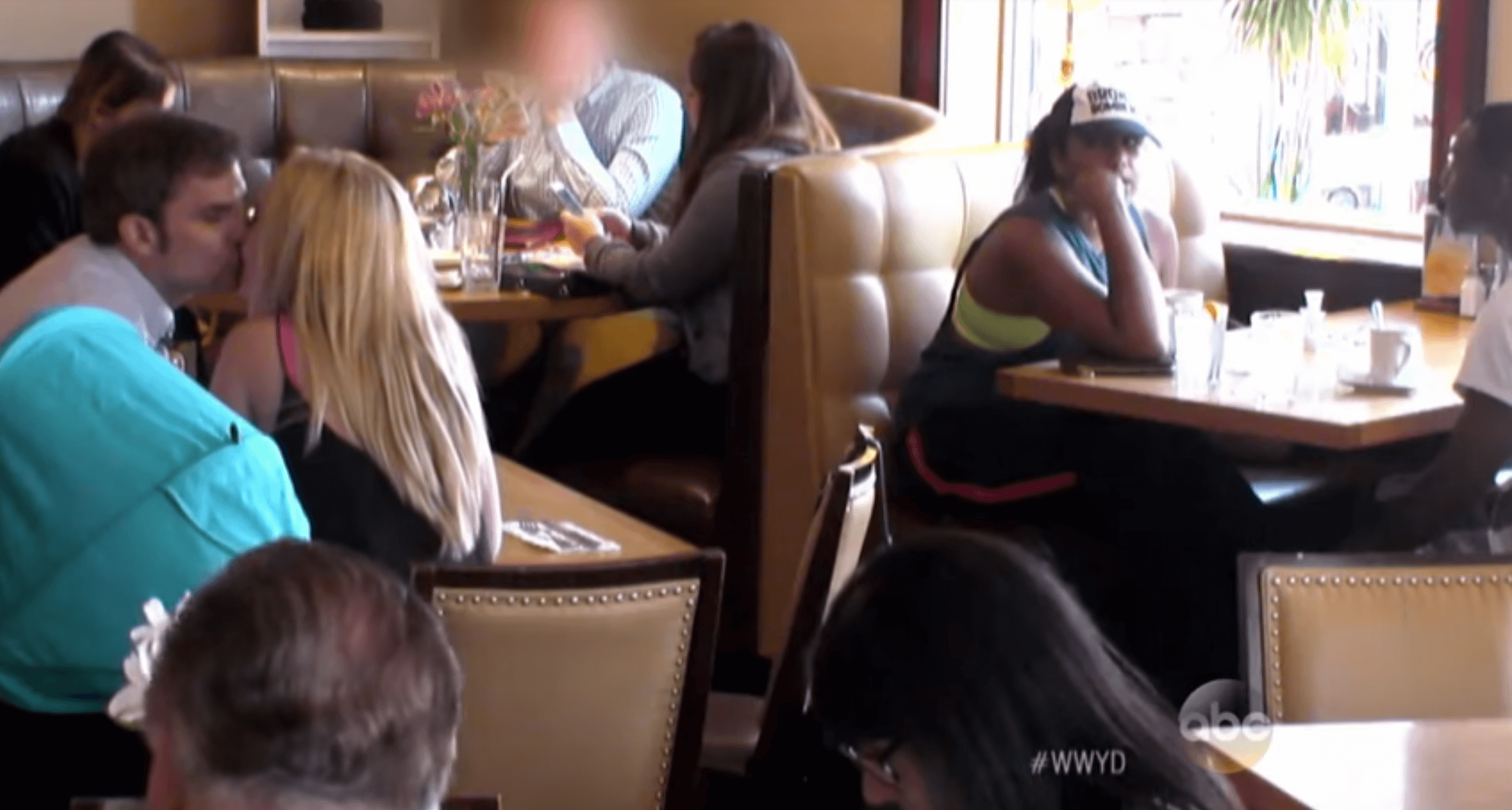 Bredvid sitter ett par som inte förstår någonting. Man ser på tjejen hur chockerad hon blir och det går att läsa av på hennes läppar att hon säger till sin kille att de måste säga någonting till frun när hon kommer tillbaka.