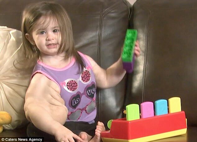 Delar av hennes överarm är lika stor som en vattenmelon och kommer fortsätta växa i takt med att hennes övriga kropp växer. För att förhindra att det växer måste hon använda kompression 24 timmar om dagen och dränera 2 gånger om dagen.