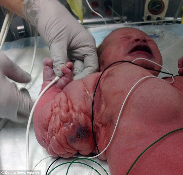 Läkare upptäckte en ovanlig vätska under en ultraljudsundersökning som gjordes i gravid vecka 15. Sedan hennes födsel har svullnaden kring hennes bröstkorg och överarmar fortsatt att växa och beräknas att väga 5 kilo.