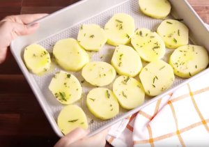 Ta ut formen ur ugnen och vänd på potatisen. Sätt sedan tillbaka formen i ugnen i cirka 15 minuter till.