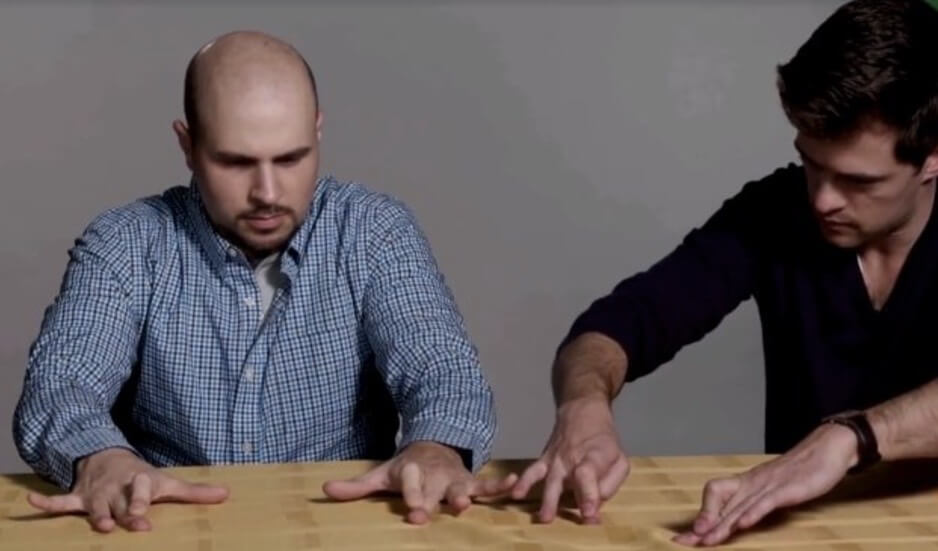 1. För lägger du handflatorna på ett bord. Lägg pekfingret över långfingret, och sedan pekfingret mot bordet.