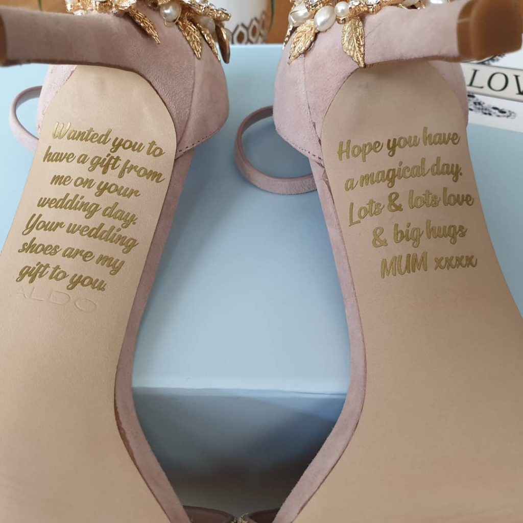 ”Ville att du skulle ha en gåva från mig på din bröllopsdag. Dina bröllopsskor är min gåva till dig. Hoppas du får en magisk dag. Massa, massa kärlek och stora kramar MAMMA xxxx”, stod det ingraverat på skosulan.