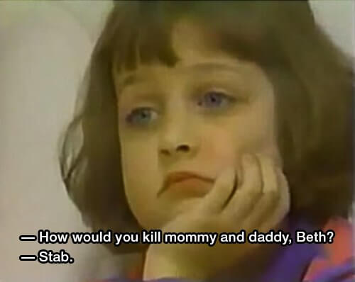 Hemma hos adoptionsföräldrarna visade Beth två sidor. En var den som oftast visades för Tim och Julie, en vuxen flicka som inte kunde skada någon. Den andra sidan var mörkare. När adoptivföräldrarna upptäckte att Beth dödat några fågelungar började de oroa sig. Och de märkte hur Beth var fascinerad av död och våld. I dokumentären från HBO, kan man höra hur 6-årige Beth pratar om hennes hemska planer, hon ville döda föräldrarna. För de som vill se hela intervjun från dokumentären, finns ett klipp längre ned.