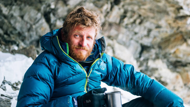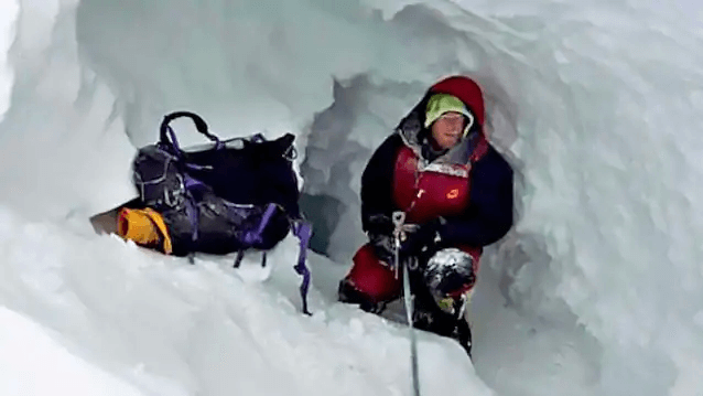 Bilden visar hur Tomasz har firat ned sig själv i en glaciärspricka på 7357 meters höjd för att skydda sig mot den hårda vinden.