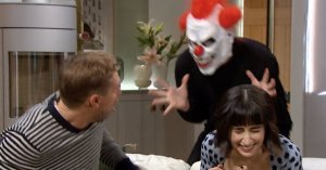 Sekunden senare kommer den utklädda clownen in och skrämmer skådespelarna rejält. Linus verkar vara den mest skärrade och utbrister: