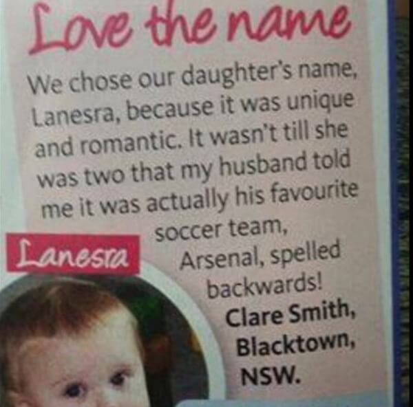 På tidningsurklippet ovan så står det: ”Vi valde vår dotters namn för att det var unikt och romantiskt. Det var inte förrän hon fyllde två som min man berättade för mig att det var hans favoritlag i fotboll, stavat baklänges!”