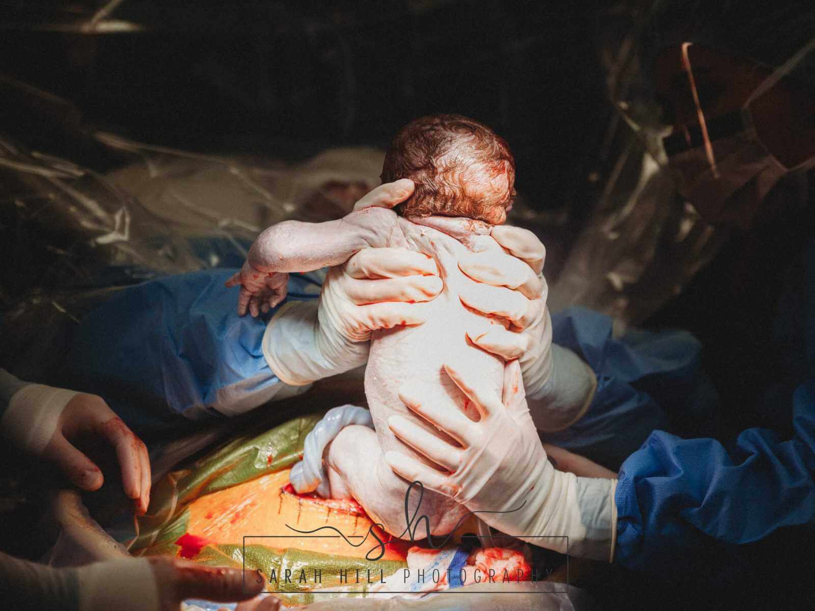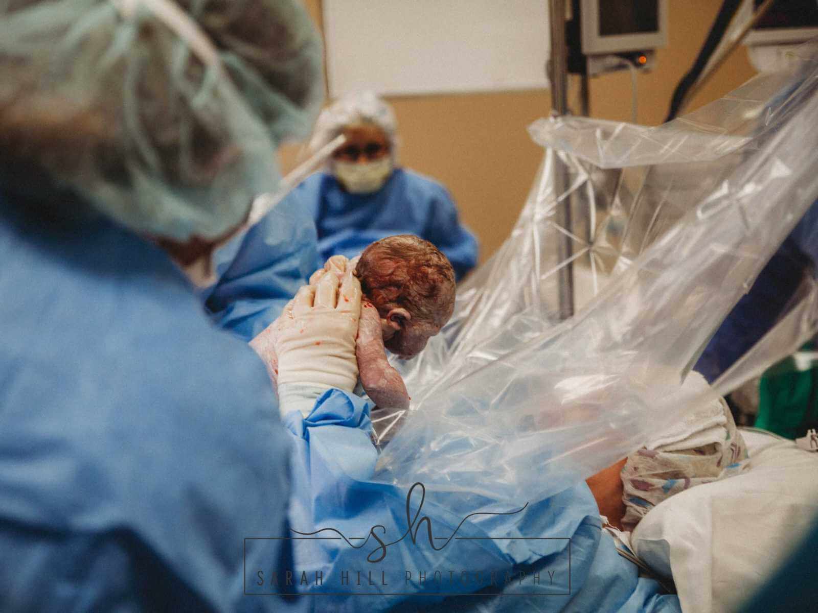 Förlossningen sattes igång och Emily fick bedövning men var såklart vid medvetandet. Hon steriliserade sina händer och fick på sig handskar och väntade tålmodigt medans läkarna gjorde ett snitt i hennes mage och öppnade upp.