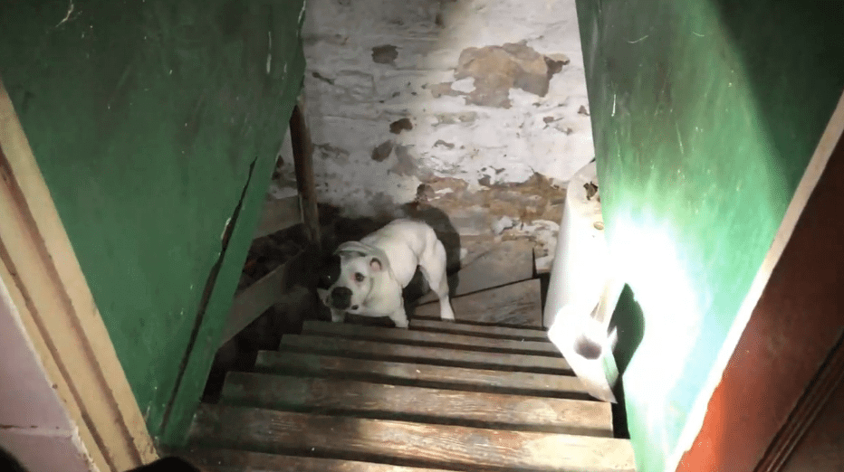 Den här stackars pitbullen blev övergiven fastkedjad i en källare. Lämnad ensam för att dö, eller med lite tur bli hittad innan det är för sent av den nya ägaren.