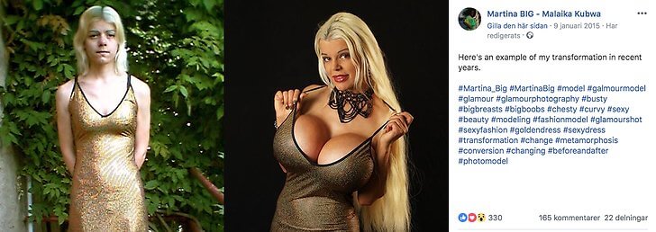 Martina har flera gånger tidigare varit i rampljuset. För ett par år sedan opererade hon sina bröst för att ha Europas största byst. I samband med operationen bytte hon även namn till Martina Big.
