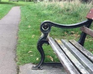 Bilden visar en park med gångväg, gräs, en träbänk och träd i bakgrunden. Någonstans på bilden gömmer sig en hund. Klarar du av att hitta den på 20 sekunder?