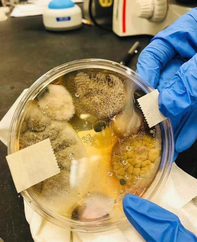 – Det här är vad som odlades i en petriskål på ett par dagar. TORKA ALDRIG era händer under en handtork igen. Det här är bakterierna som du vrider runt i dina händer samtidigt som du tror att du går ut med rena händer.