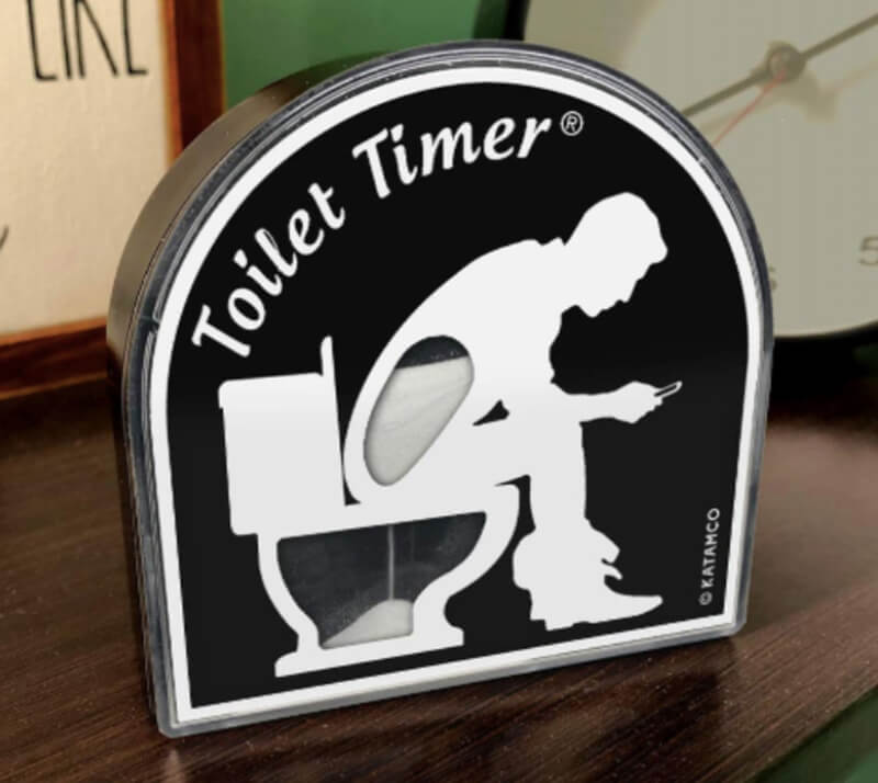 Den här timern låter sand rinna ned, och den ger dig 5 minuter för att klara av dina måsten på toa. När tiden är slut får du inte sitta längre och då kan det se ut som att timern ”ryter ifrån”.