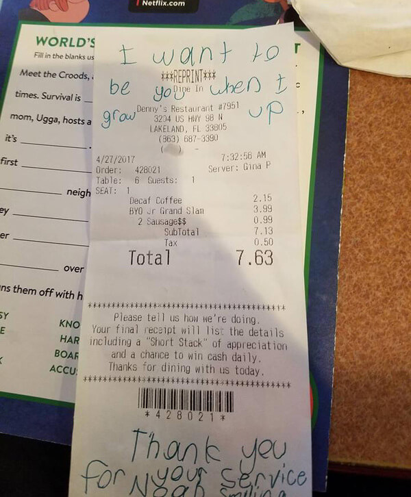 ”Jag vill bli som du när jag växer upp. Tack för ditt arbete” stod det på kvittot.