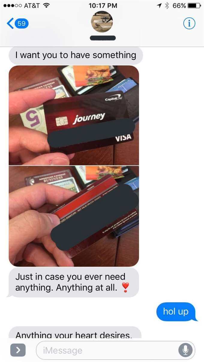 ”Jag vill att du ska köpa dig något. Ifall du någonsin behöver något. Vad som helst. Vad ditt hjärta än behagar”.
