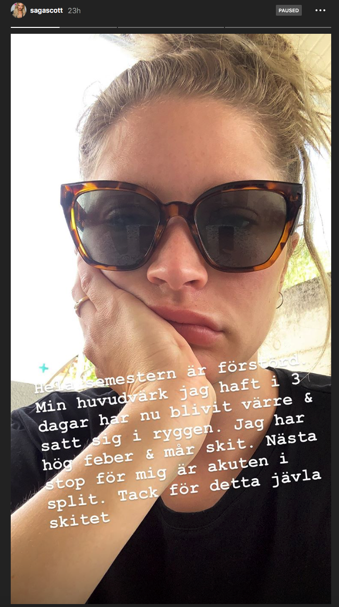”Hela min semester är förstörd. Min huvudvärk som jag har haft i tre dagar har nu blivit värre och satt sig i ryggen. Jag har hög feber och mår skit. Nästa stopp blir akuten i Split. Tack för detta jävla skitet”, skriver hon på sin Instagram story.