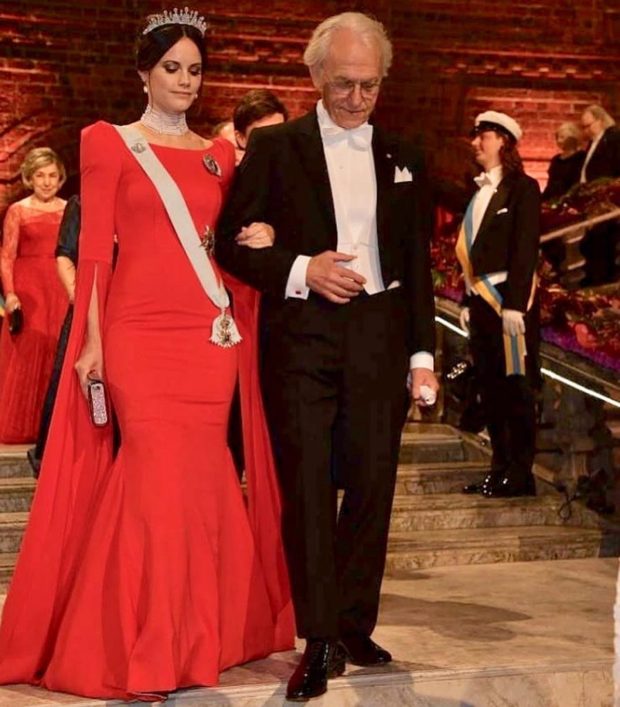 Prinsessan anlände tillsammans med sin bordsgranne, fysikpristagaren Gérard Mourou till festen med en vacker röd klänning, en tiara och ett pärlhalsband.